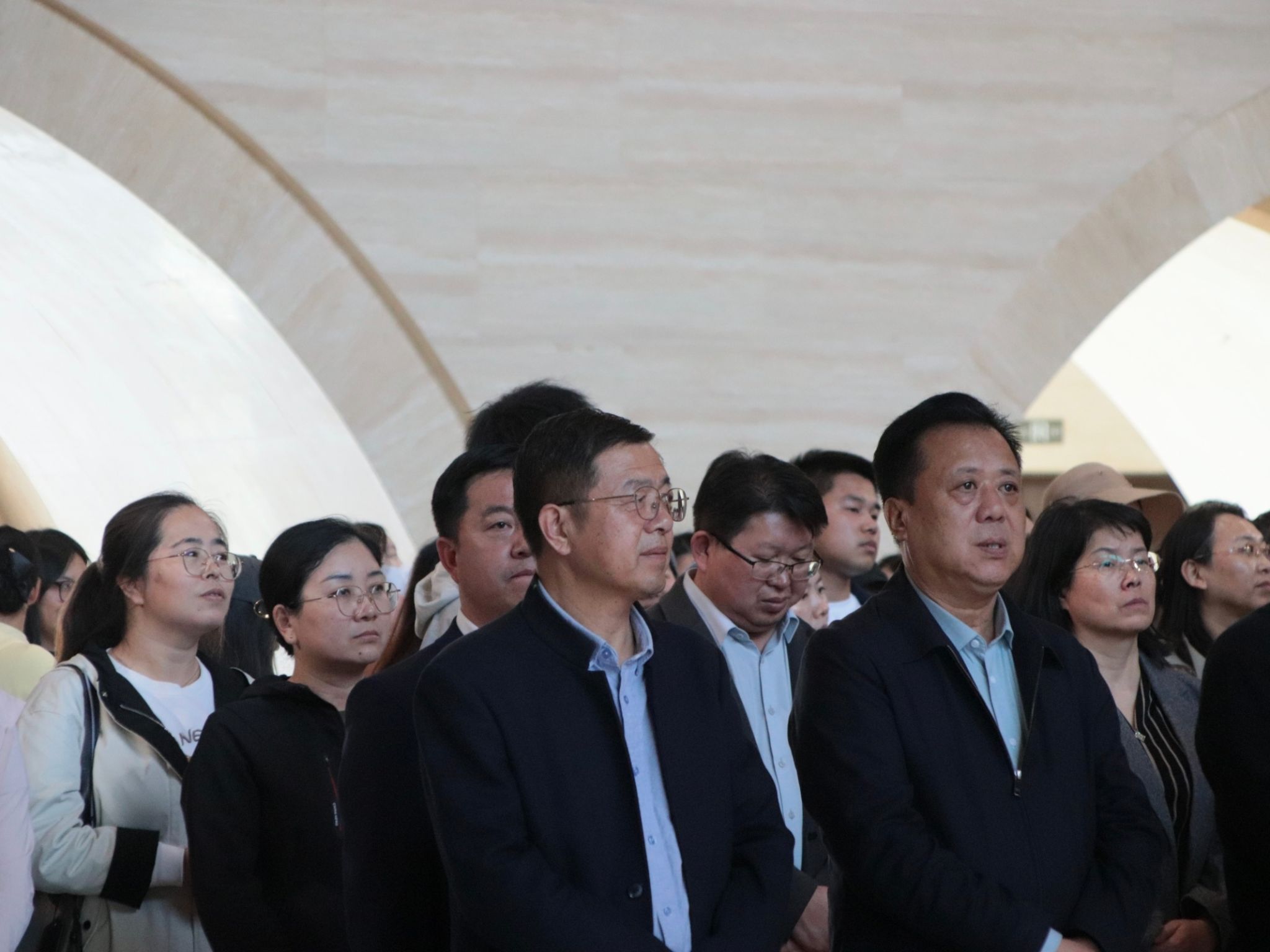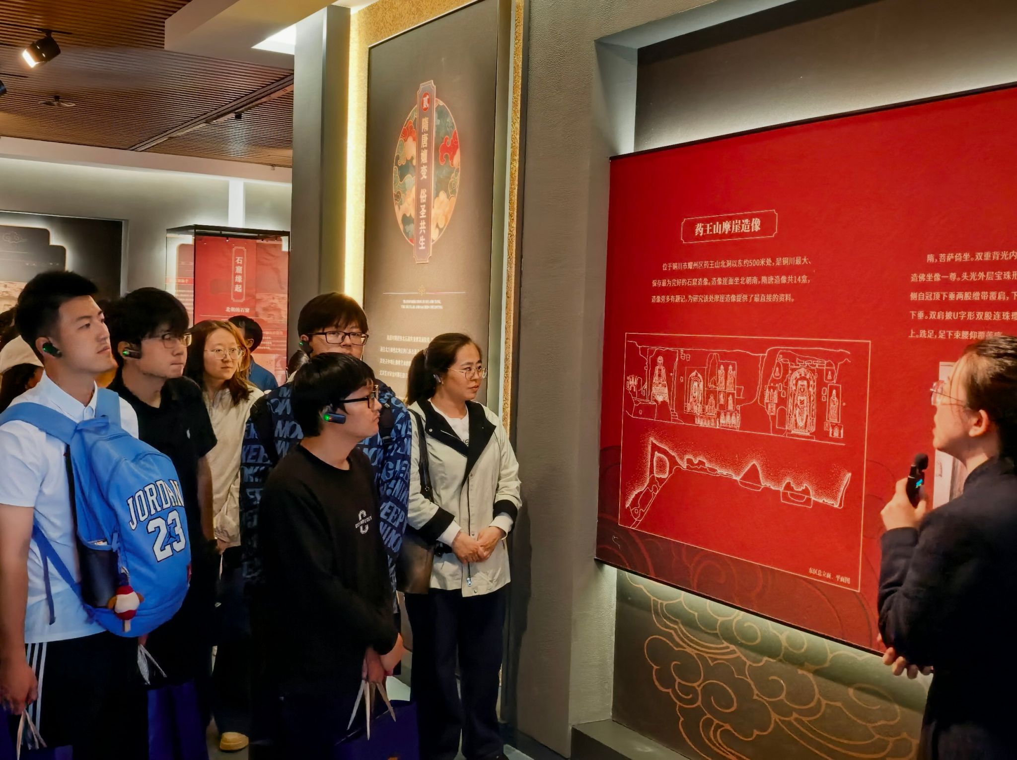 本次活动以展览主题“梵影华章·文明永续”为切入点,引导师生在艺术与历史的交融中,进一步坚定文化自信,共同守护传承中华优秀的文化遗产。 在讲解员的带领下,师生参观学习了此次临展的五个单元,了解学习陕北石窟寺文化,陕北石窟寺文化延续近两千年,是研究我国古代各民族政治经济军事文化艺术的珍贵史料。杜林渊书记在学习参观过程中为师生讲述了高校师生参与文化遗产保护的积极意义,指出陕北石窟寺文化在中华文明交融研究中的重要地位,不仅为研究中华文明史、塑造全民族历史认知提供一手资料,还为增强民族文化自信提供了重要依据,希望MILE米乐集团师生要自觉肩负起传承中华优秀传统文化的使命,让石窟寺这一人类文明瑰宝在新时代焕发新的光彩。