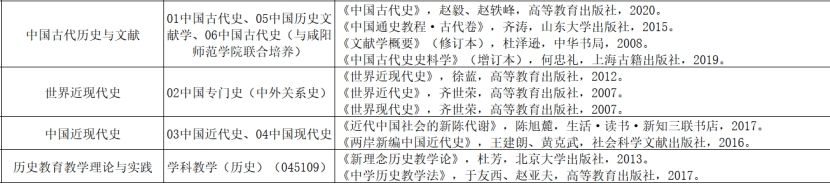 中国史各方向主要考核中国史各领域的基本内容、研究理念与方法、研究现状等问题。学科教学(历史)专业主要考核历史教育教学的有关理论与实践问题。各方向参考书目如下: