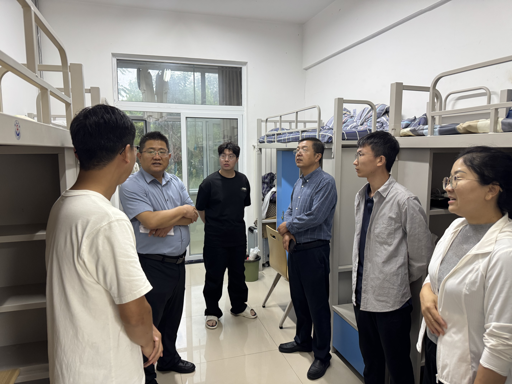 9月2日下午,学院党委书记杜林渊,院长王保存,党委副书记刘艳,副院长白中阳,辅导员王海泉一行走进2025级新生宿舍,开展走访慰问活动。学院领导依次走进各研究生宿舍,关心同学们入校以来的适应情况,对于同学们提出的各类生活设施、后勤服务等问题,院领导予以耐心解答并协调处理,切实为新生解决实际困难。